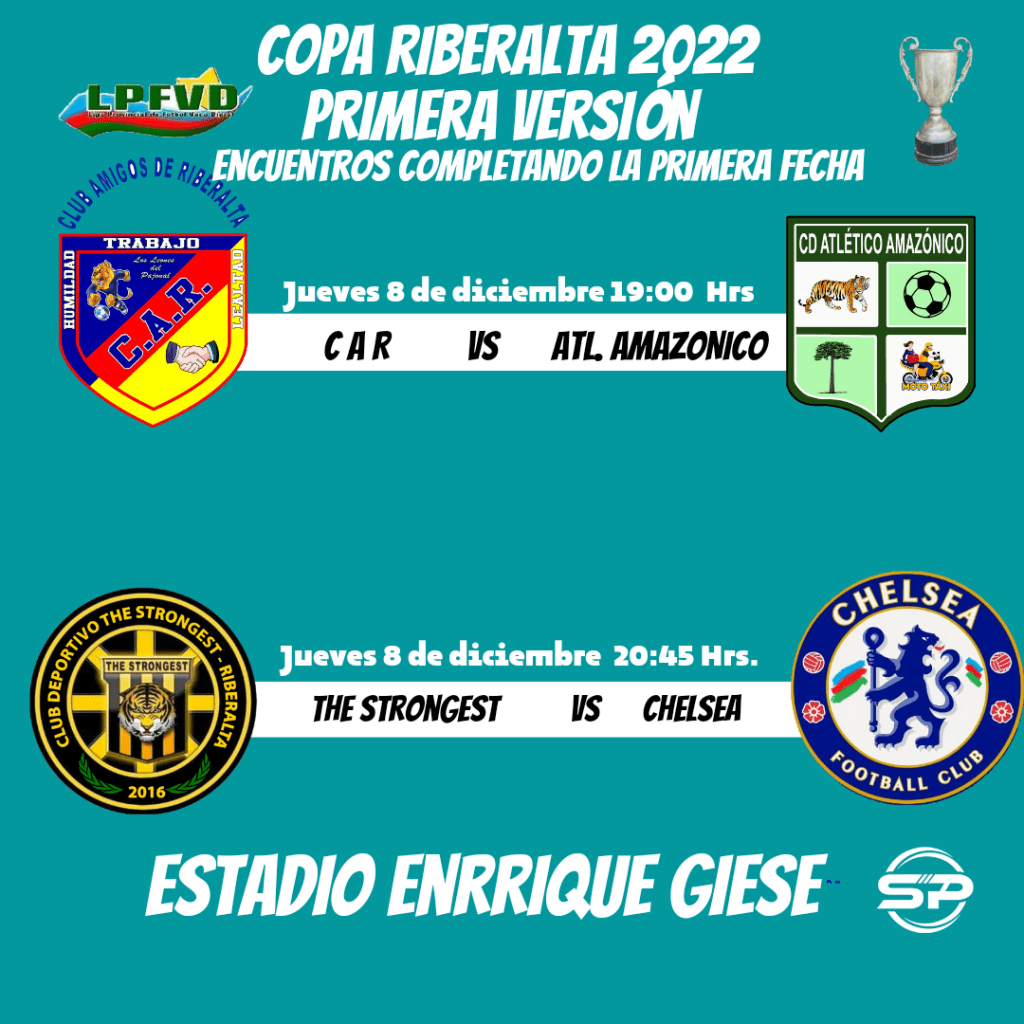 CopaRiberalta2022Primera VersiónHoy concluye la primera fecha de la Copa Riberalta.CAR vs #AtlAmazonico este encuentro esta pactado para las 19:00 pm.El encuentro de fondo #TheStrongest vs #ChelseaA partir de la 20:45 pm.Estadio Enrrique Giese.SPORTAmazonia1SPORTAmazonia